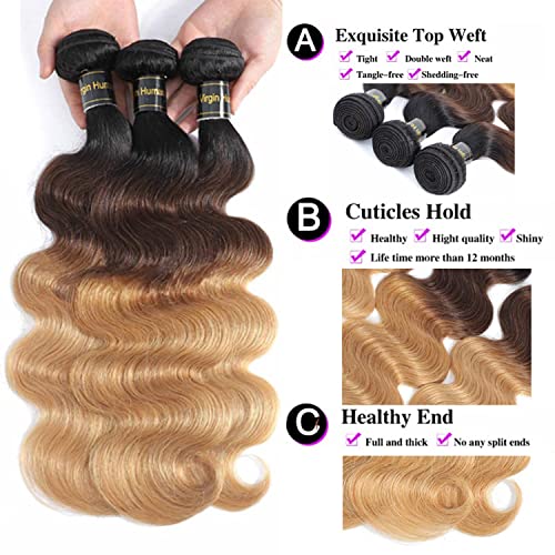 Shining Girl 12A Ombre Body Wave Bundles With Closure Brazilian Virgin Remy 100% Human Hair Ombre 3 Tone T1B/4/27 Color Human Hair Extensions 3 Bundles with 4x4 Lace Closure (14 16 18+12, 1B#/4#/27#)