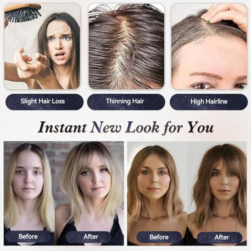 - Hair Topper With 3 Anti-Slip Clips£ºJust take a few seconds to apply, providing secure yet comfortable attachment for all day wear.Cut or curl the bangs to any style your like to fit your face. Compared to 100% density, our clip in topper has denser hairline, thicker top hair and the closest appearance with real human scalp ,it is very natural and no one will find your secret