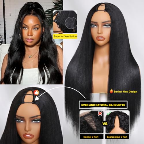 Sunber Yaki Straight V Part Human Hair Glueless Wig Upgrade U Part Wig No Leave Out Vpart light yaki straight Machine Made Clip In Half Wigs No Leave Out Real Scalp V Shape 150% Density 20Inch