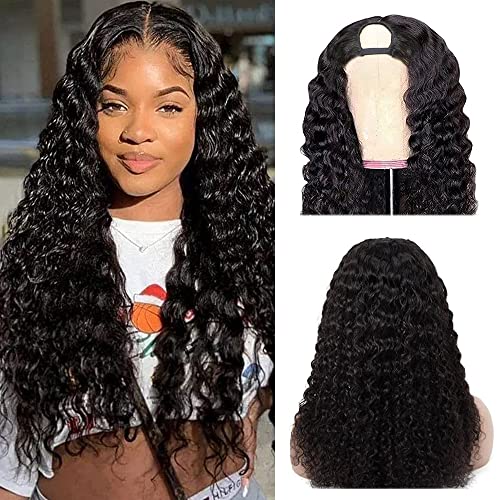 U Part Wigs Human Hair for Black Women Deep Wave Human Hair Brazilian Hair Full Head Clip in Half Wig V Part Glueless Wigs Human Hair Pre Plucked U Shape Wigs (Natural Black, 18 inch)