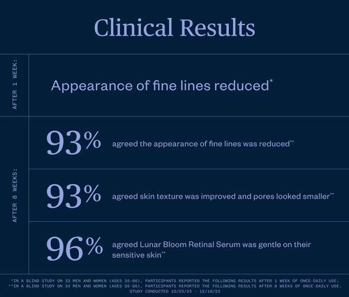 - LUNAR BLOOM RETINAL SERUM - Powered by Retinal—a skin-supercharging vitamin A derivative—plus micronutrient-rich forest actives and night-blooming flowers. Lunar Bloom Retinal Serum is a potent yet gentle ritual for evening skin texture and smoothing the appearance of fine lines.
