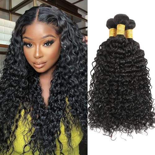 Water Wave Human Hair Bundles - Natural Black Wet & Wavy Curly Sew In Weave, Soft & Shed-free 12A 100% Brazilian Virgin Remy Hair - 3 Bundles, 12, 14, 16 Inch