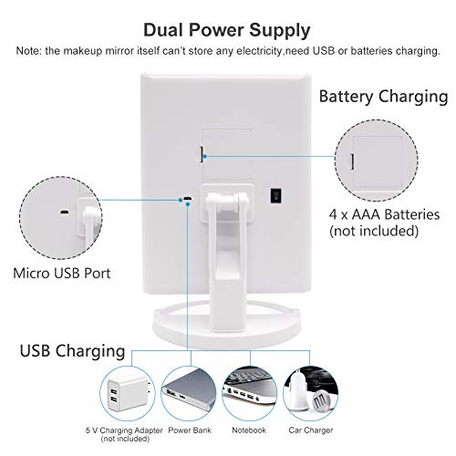 - Dual power supply: This Led mirror can be operated with 4 AAA batteries (not included in the package) or USB cable (including USB cable), the mirror itself cannot store power