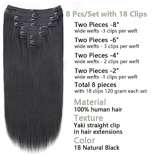Yaki Straight Clip in Hair Extensions for Black Women Thick Light Yaki Straight Clip ins 100% Real Soft Human Hair 8Pcs Per Set with 18Clips Double Lace Weft,120Gram Natural Black (26Inch, #1B)