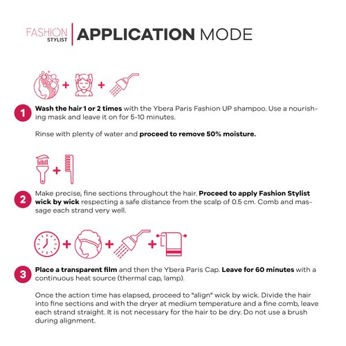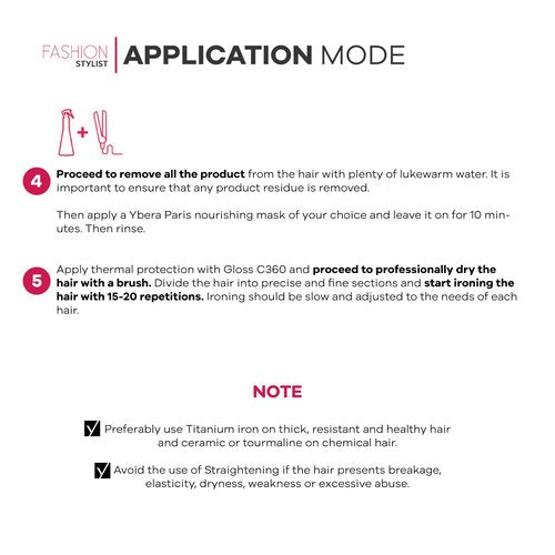 - Exclusive for Professional Use; Ybera Line should be applied by an expert who will determine the best treatment and the termic action to be applied on the hair