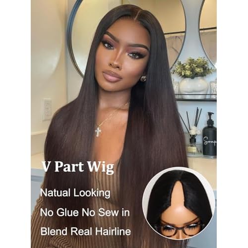- NEW HUMAN HAIR YAKI STRAIGHT V PART WIG:Upgrade U Part Wig,No Glue,No Lace No Sew In No Stocking Cap Needed,Minimal Or No Leave Out,Blend Perfectly With Your Natural Hair,Easy To Install And Take Off,Saving Your Time,Protect Your Edge,Friendly To Beginner