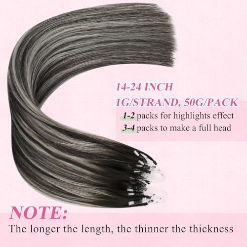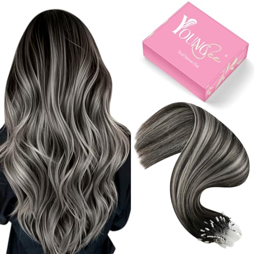 YoungSee Micro Loop Hair Extensions Real Human Hair Ombre Microlink Hair Extensions Balayage Black with Silver Bead Hair Extension Human Hair Straight 24 Inch 50g 50s